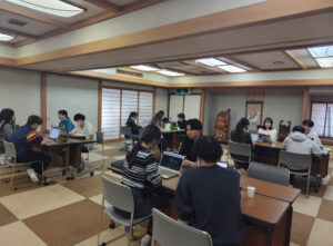 宿泊先で会議室をお借りし、スマートシティの初めてのグループワークを行いました。最初に、まき先生よりスマートシティの活動についてお話していただきました。その後、グループごとに方向性や訪問したい企業について話し合いました。スマートシティのスタートとなる大事な時間でしたが、集中して有意義な時間を過ごすことができました。